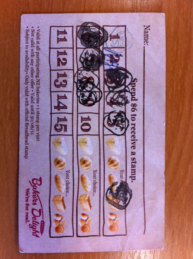 As a goodly loyal bread-consumer, I collected my stamps $6 at a time as required (two loaves of bread for $6.50, a bargain!). Once I got to the 5th stamp, the Saturday lady (not the lovely Angela, some harpy called Sue) explained to me that I needed to redeem my freebie right then and there. I had to buy my two loaves of bread, and then take my other loaf at the same time. Huh?! Here are the rules in the world according to Baker’s Delight: